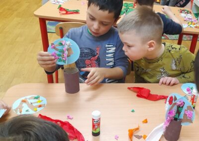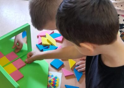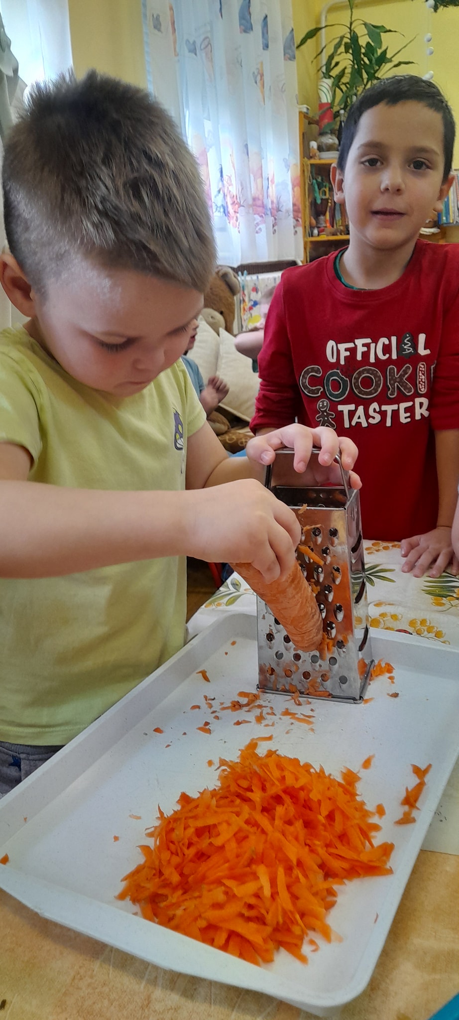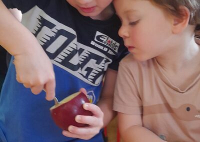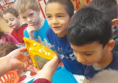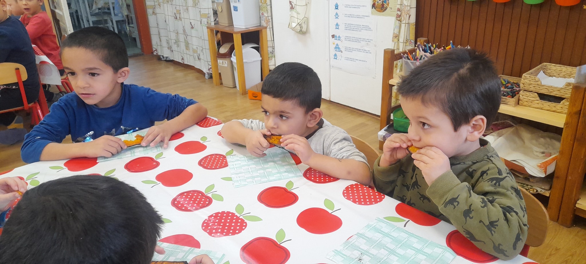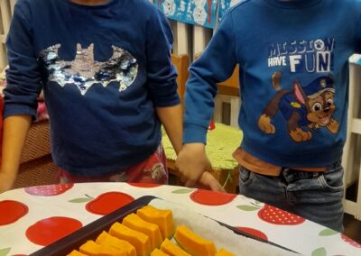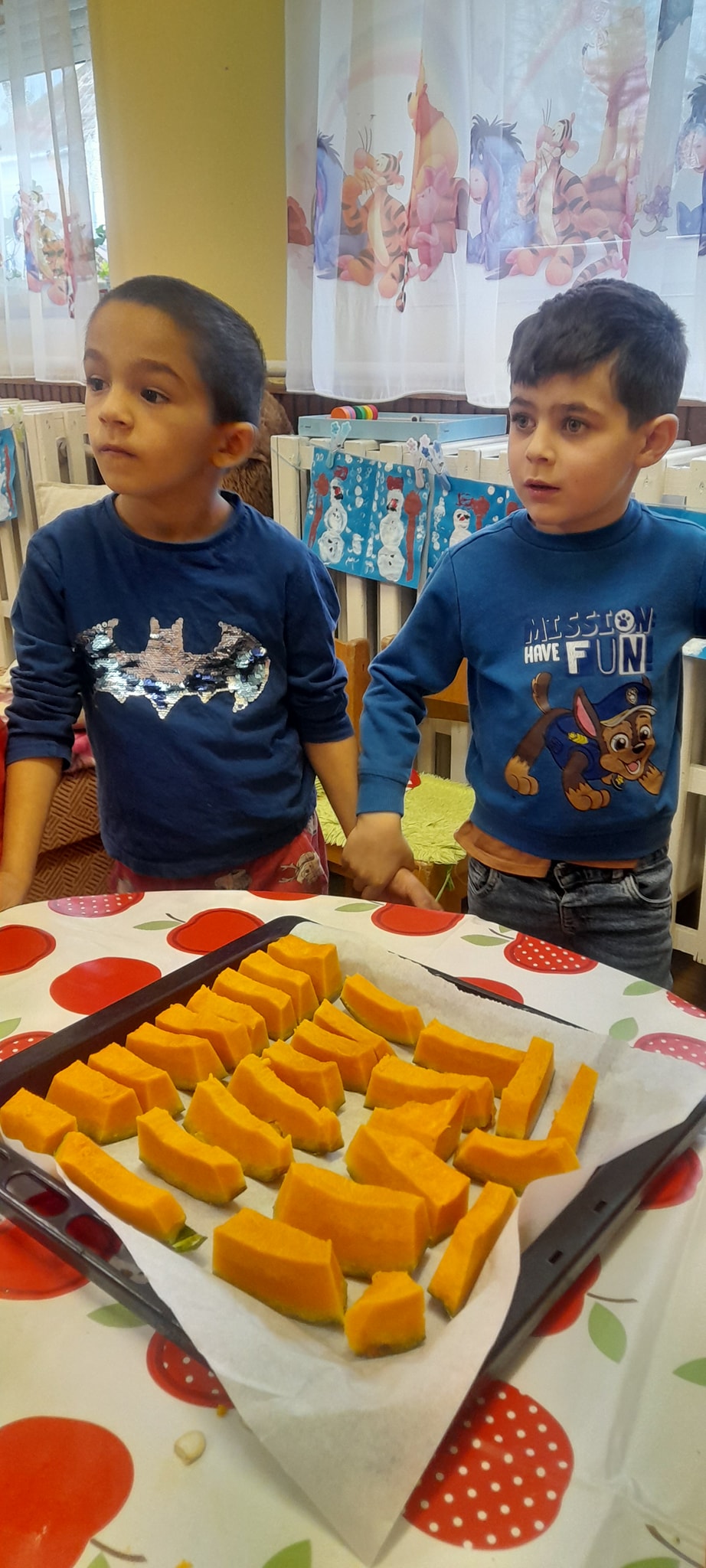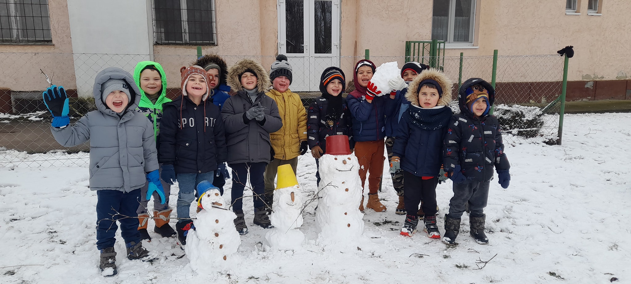 A hóesést kihasználva a csoport apraja-nagyja jól érezte magát, a játék után jól esett a frissen sült tök csemege. A téli örömök mellett a színek-formák-tükörkép témákkal ismerkedtünk.