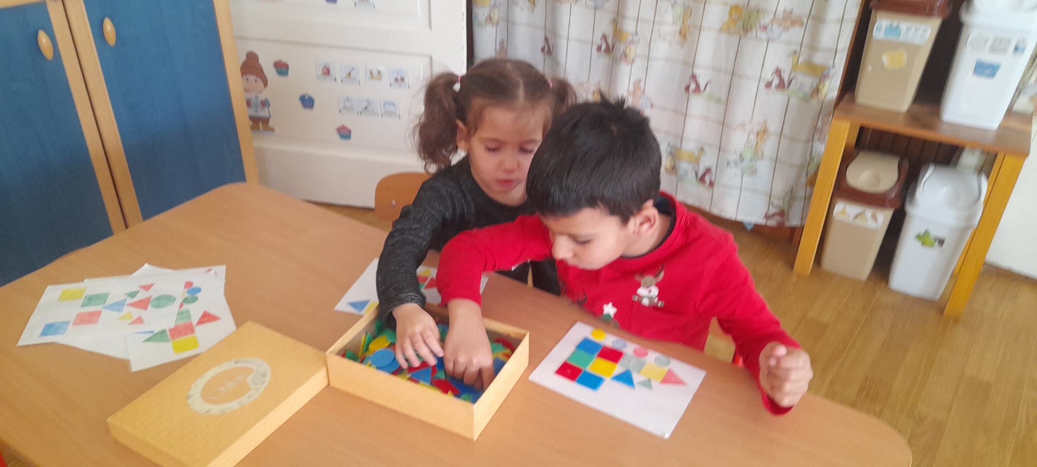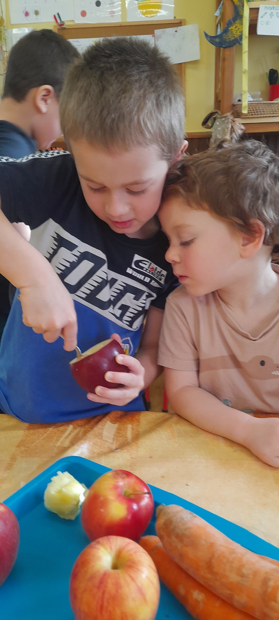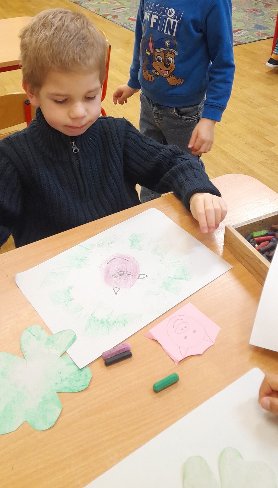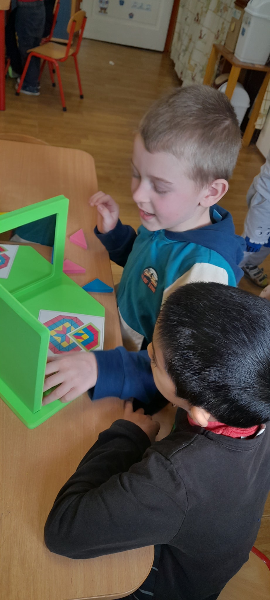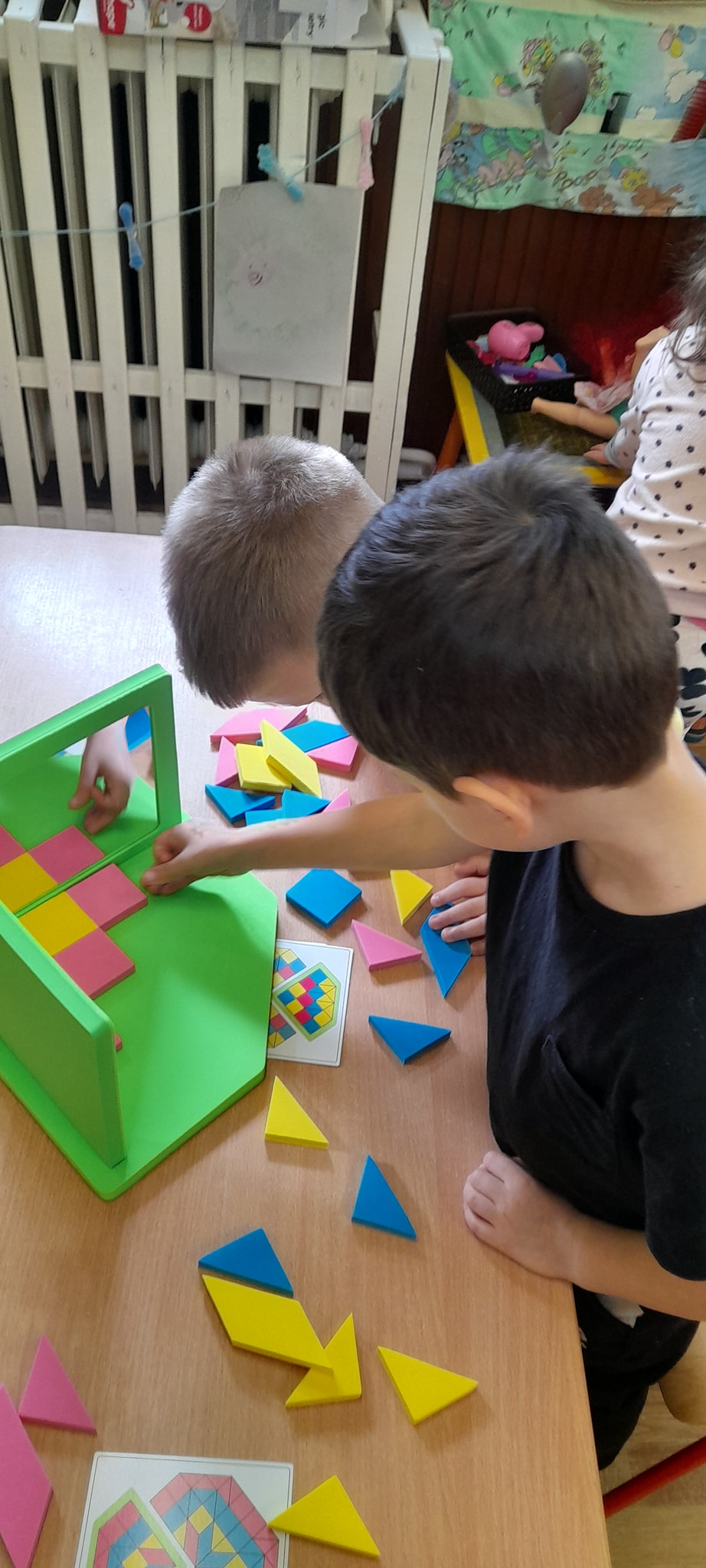 A hóesést kihasználva a csoport apraja-nagyja jól érezte magát, a játék után jól esett a frissen sült tök csemege. A téli örömök mellett a színek-formák-tükörkép témákkal ismerkedtünk.