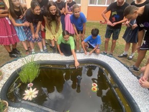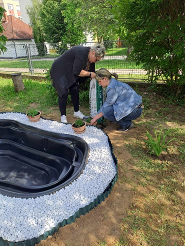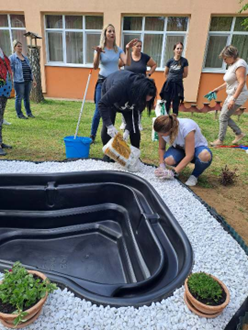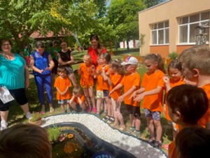 Alkalmas a vizes élőhelyek élővilágának megismerésére, kétéltűek és „vízi parányok” megfigyelésére, a tavasztól-őszig tóban lakó ékszerteknős, aranyhalak gondozására. Ékszerteknősünk életét folyamatosan szemmel követik a gyermekek, gyakorolják a felelősségteljes állatgondozást. Leggyakoribb vízi és mocsári növényeinket is megfigyelhetik itt, azok ökológiai fontosságáról ismereteket szereznek. A kis tó segítségével a víz változásairól, tulajdonságairól: színéről, mennyiségéről, hőmérsékletéről, halmazállapotáról is tapasztalatokat szereznek. A tó vízvizsgálatát, egyszerű játékos kísérletek elvégzését teszi lehetővé. A vízzel kapcsolatos szenzitív játékok segítenek a víz fontosságát megéreztetni, védelmére irányítani a figyelmet. A kis tó melletti interaktív tábla segítségével játékos formában ismerkedhetnek a vízhez kötött állatok külső tulajdonságaival.